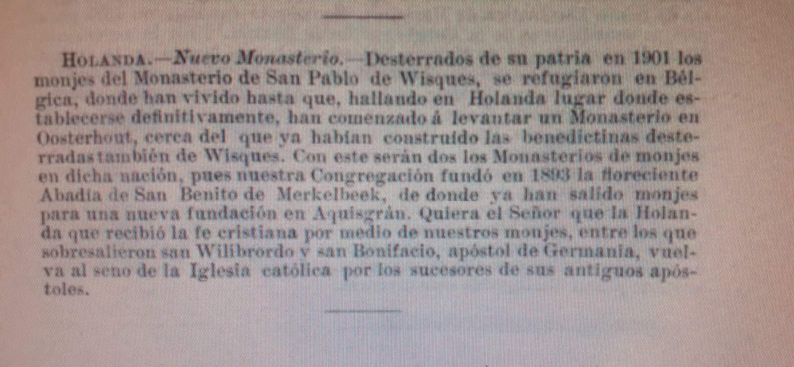 La abadía benedictina de St. Paul de Oosterhout (Holanda) fue fundada por los monjes de Wisques Abbey (Francia), que se vieron obligados a salir de Francia por las políticas anticlericales y sentimiento popular de la época.