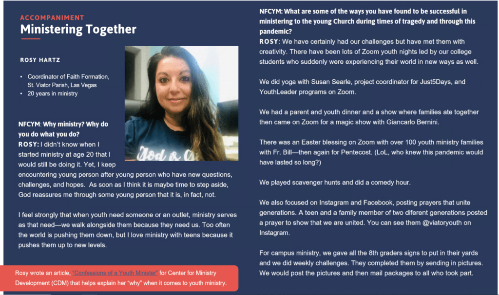 Rosy fue una de las ocho responsables de jóvenes de todo EE.UU. que aparecen en el informe anual de este mes en la Federación Nacional para el Ministerio de la Juventud Católica con sede en Washington. Concretamente, se destacó como miembro activo al servicio de la iglesia joven, en una sección llamada «Acompañamiento: Caminando juntos».